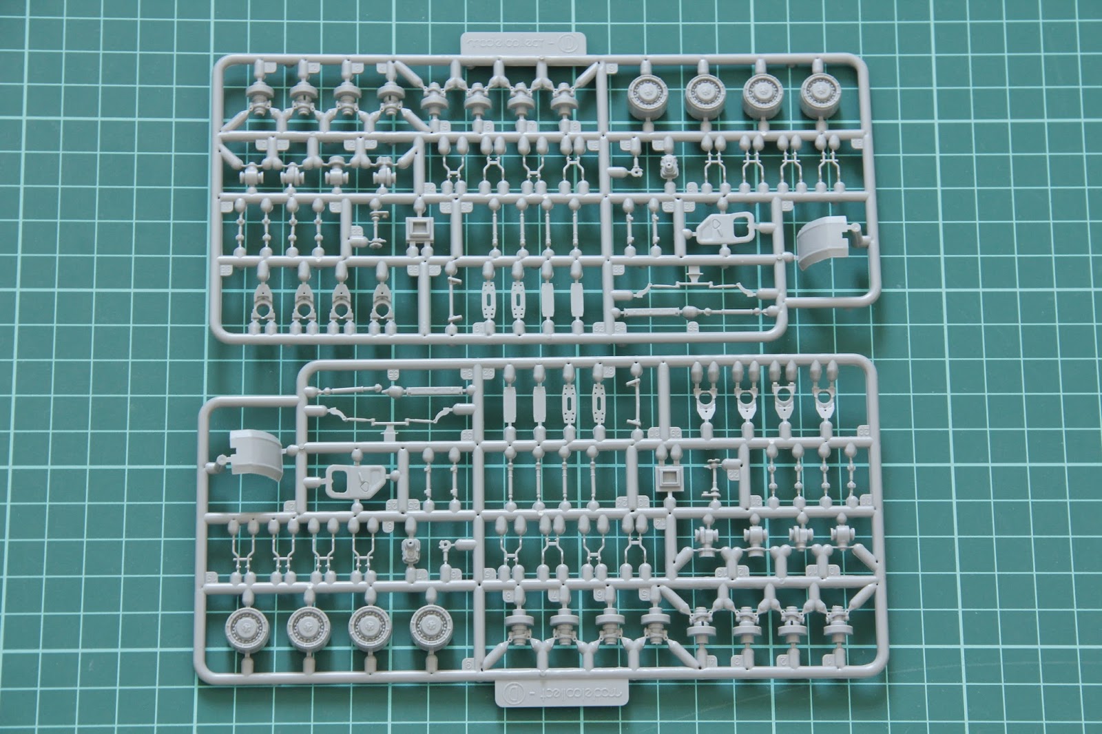 Две рамки на фото выше абсолютно идентичны и содержат одинаковые детали. Здесь моделист найдёт цельные диски, отдельно отлитые двери и крылья. Много деталей отсюда пригодятся для подвески.