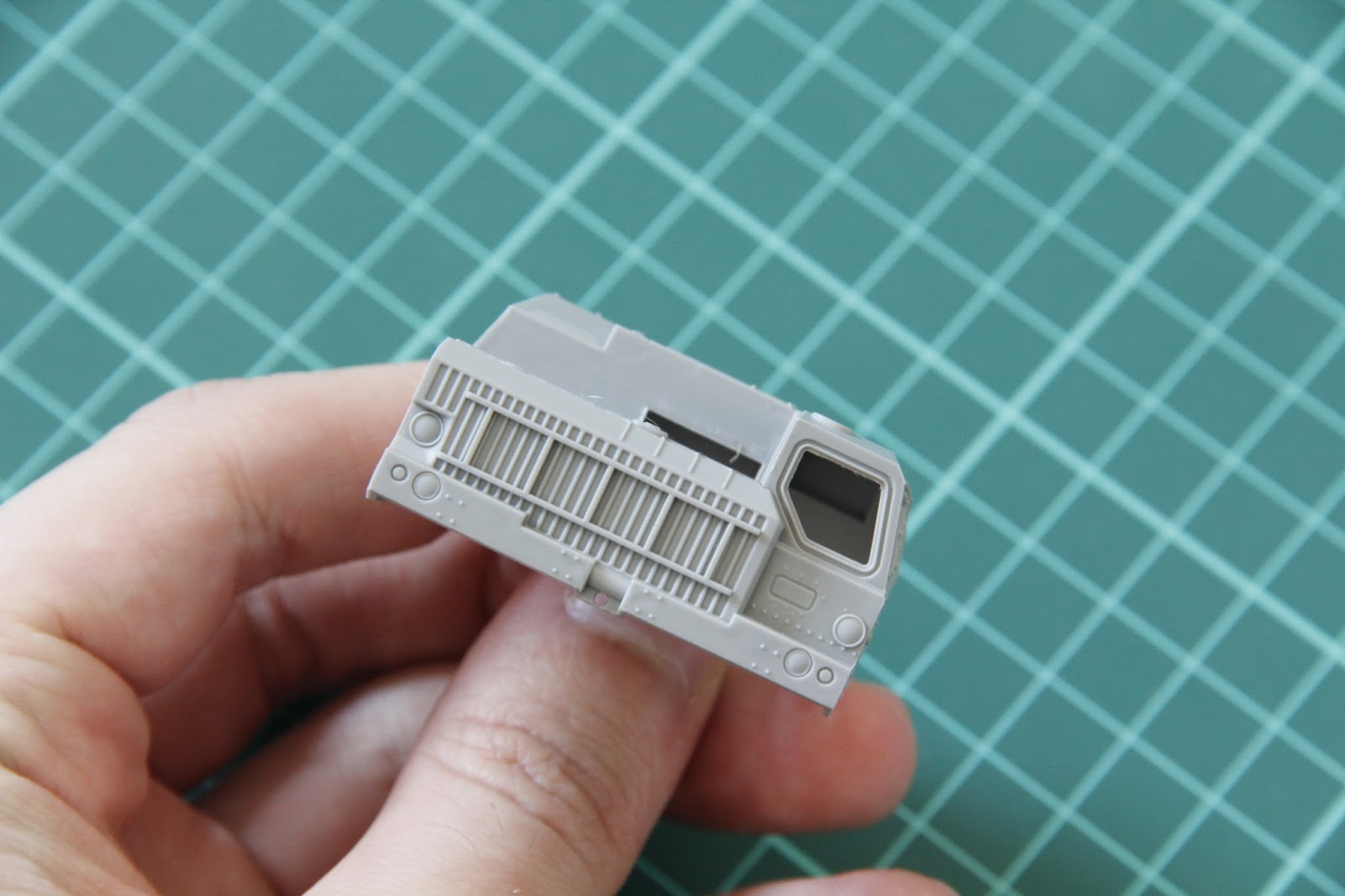 Передняя секция кабины отлита цельной деталью. Разумеется, двери, стёкла и некоторые другие небольшие детали должны быть установлены отдельно. Подобное членение пригодится при сборке и упростит её.
