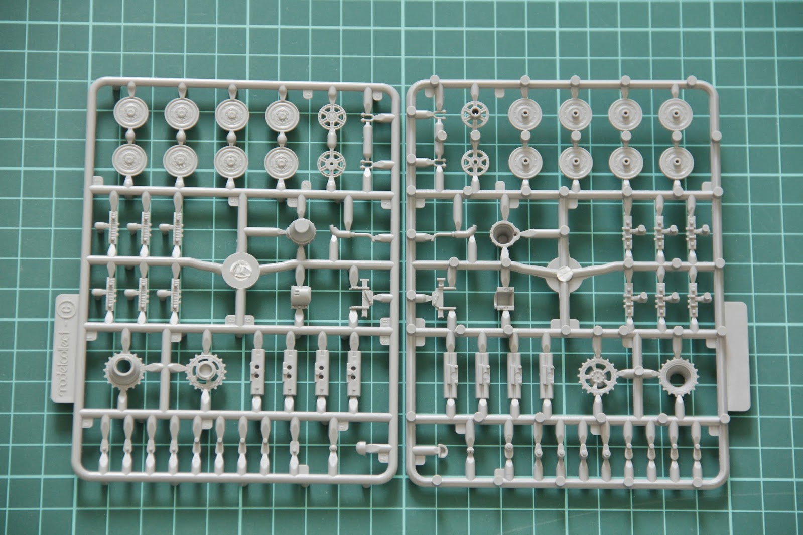 Первыми идут два литника, которые выделены под детали подвески и небольшие внешние элементы. Катки отлиты целиком, тогда как ведущие должны быть собраны из двух деталей.