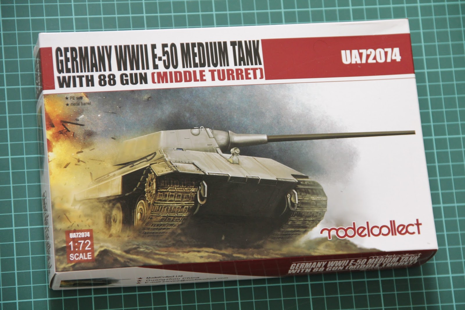 Танки от Modelcollect уже довольно хорошо известны, а сам производитель продолжает выпускать интересности в таком небольшом масштабе. Сегодняшний обзор посвяшён новому набору, который копирует "бумажный танк" Е-50 с 88 орудием. Разумеется, пластик отлит в масштабе 1/72, и упакован в красивую коробку с приятным боксартом. Внутри вы найдёте литники вместе с небольшими бонусами для танка. Давайте откроем коробку, и рассмотрим всё поближе.