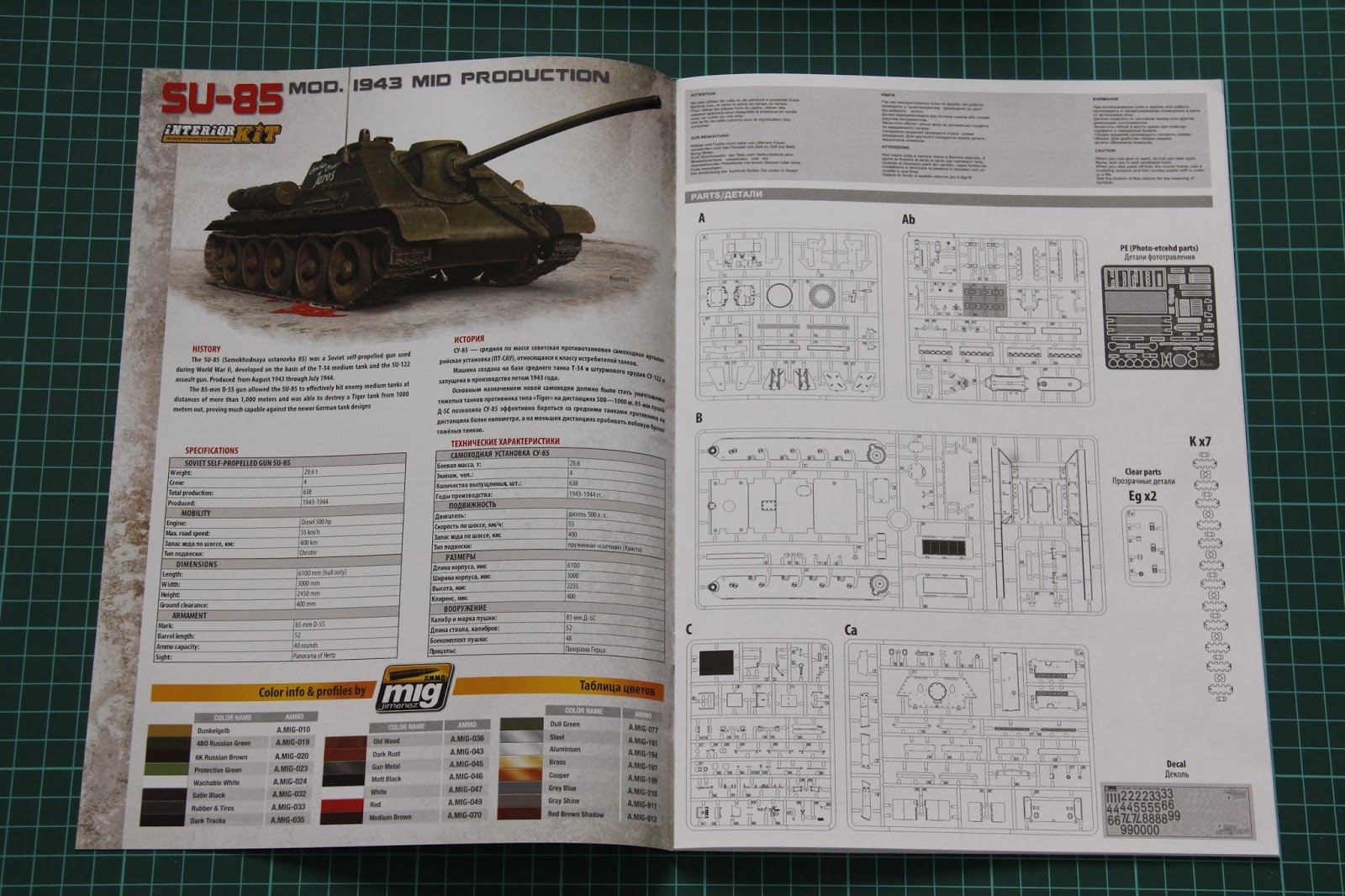 Инструкция по сборке выполнена в виде красивой брошюры с коротким списком особенностей на первой странице. Далее следует историческая заметка и карта деталей, только затем начинается процесс сборки. На одной из крайних страниц вы найдёте варианты окраски, разработанные совместно с Ammo MiG. Ниже вы можете видеть фото инструкции.