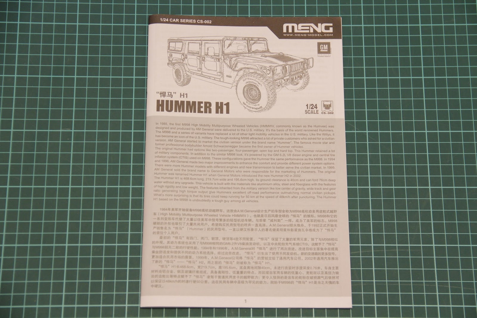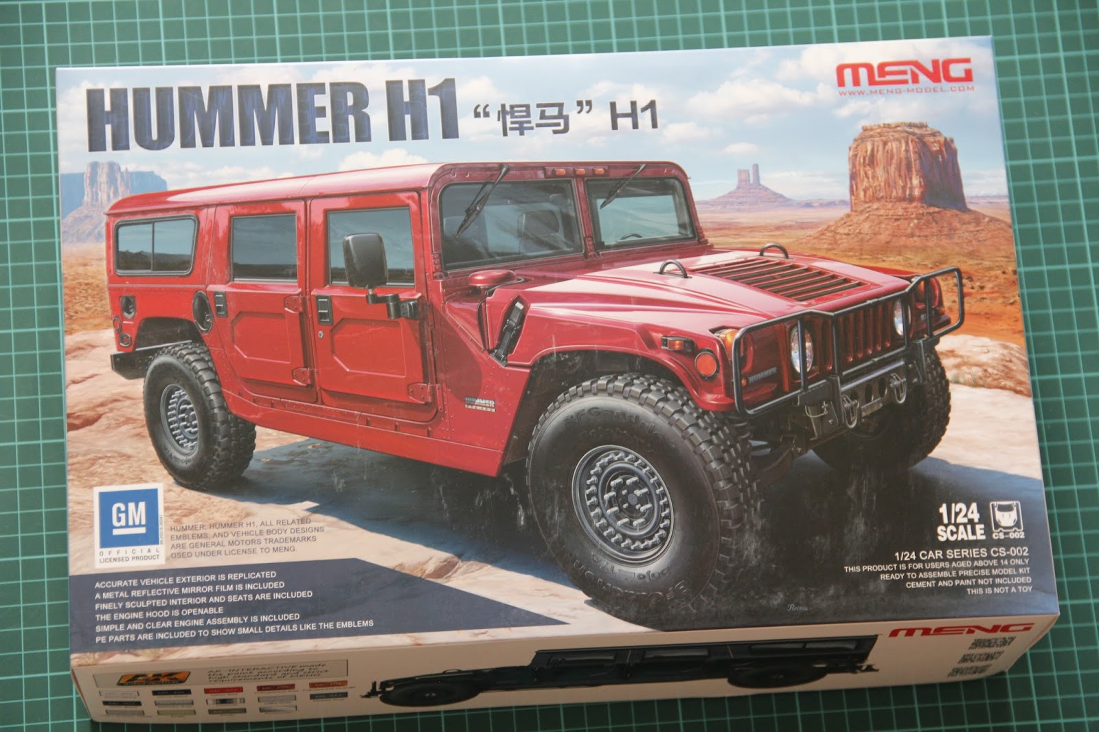 Today's review is dedicated to the kit, which I was waiting for since the moment it was announced. Yes, this is 1/24 scale HUMMER from Meng, it's civil version to be precise. Their first kit in this series was Ford pickup, and now they continue lineup with big vehicle created in cooperation with GM. Box size is surprisingly big, and assembled model should have length more than 20 cm. On the front side modeler will find nice boxart and short list of features. Inside each frame is packed into separate plastic bag, and there is enough space for all sprues. Let's open the box, and check everything closer.