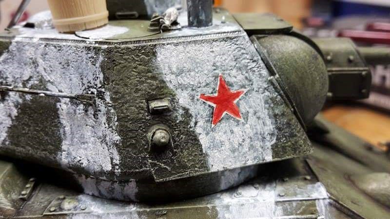 Úmyslně jsem kamufláž nedodělal – má být „WIP“ (work in progress) – rozdělaná, o čemž svědčí i dva kýble vápna na tanku a odložené koště, jímž jej posádka v polních podmínkách nanášela.