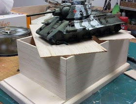 On the stand I've added pedestal out of balsa, which will make model visible on the exhibitions. It's empty inside, and I've left appr. 1-2cm from top in order to place top panel. On the prepared surface I poured clay.