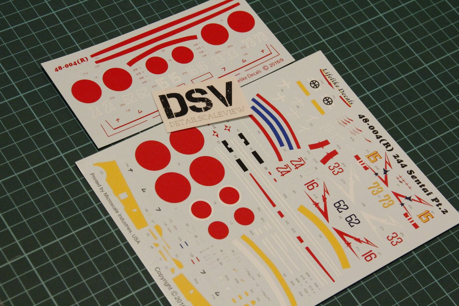 In total there are two decals sheets. Both will help you copy aircraft from 244th Sentai in 1/48 scale. Printing quality is excellent, I didn't find any obvious problem. Both are printed by Microscale, so that's why all symbols look good.
