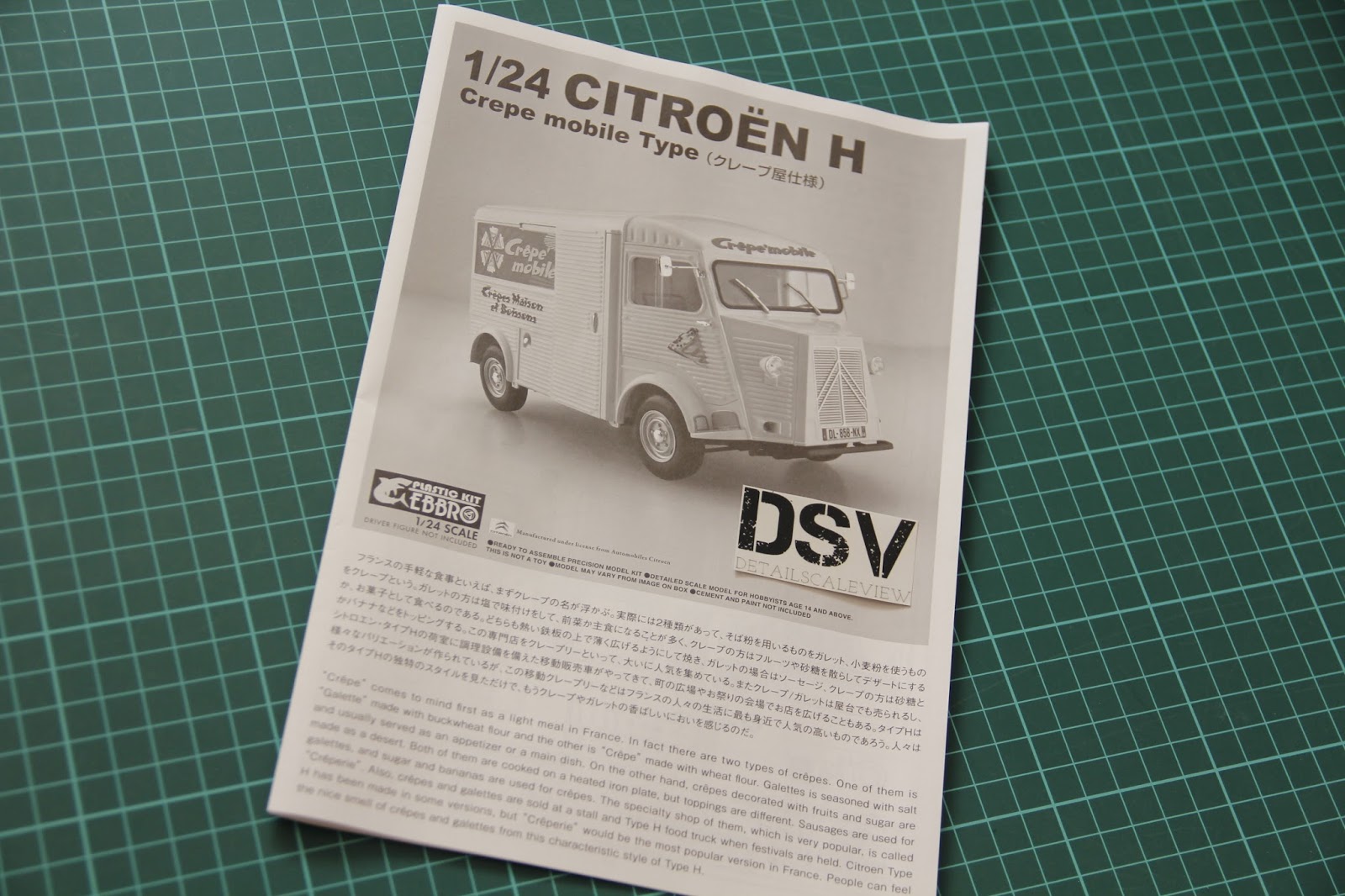 В этот раз у нас есть шанс рассмотреть новинку от Ebbro - 1/24 Citroen H Crepe Mobile Type. Как вы можете догадаться из названия, пластик копирует французский автомобиль с блинами. Да, довольно необычный тип, и он явно добавит разнообразия в жизнь автомобильного моделиста. Более того, подобный фургон будет интересен в качестве основы для "тюнинга" или даже везеринга, так что итоговый вид зависит только от вас. Набор поставляется в красивой коробке, все рамки упакованы в отдельные пластиковые пакеты. Давайте откроем их и рассмотрим всё поближе.