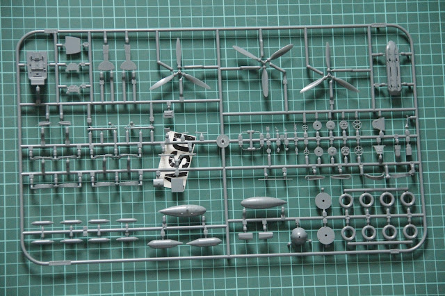 Next sprue is also busy with different bits. In upper left corner you can see cockpit floor. Three propeller types hint that two will go into your spare parts.